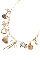 Charm Necklace a delightful mix of charms, including a Bow, Checker Heart, Rhinestone and heart charms, all beautifully strung on a sleek chain. The checker pattern brings a trendy, bold vibe, the heart represents love, and the rhinestone charm adds a bit of glamour and shine. Product details length: 17" charm size: varies .25" - 1.25" ext: 3" Ball Chain Ext clasp: Lobster Claw metal finish: Gold Plated product: Lead & Nickel Compliant anti-tarnish: Double E-coating