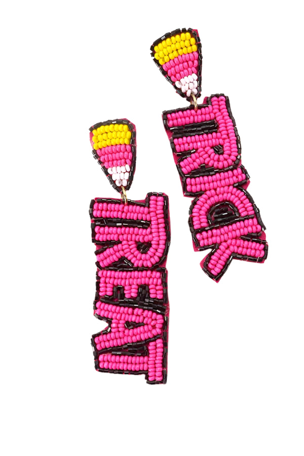 Halloween Trick or Treat Beaded Drop Earrings - the perfect accessory to add a touch of spooky fun to your Halloween ensemble. Crafted with attention to detail, these earrings feature delightful Trick or Treat motifs crafted from colorful beads, dangling from sleek hooks. The playful design and vibrant colors make them ideal for adding a festive flair to your Halloween costume or outfit. Product Details: Length: 3" Width: .75" Earring back: Post Metal finish: gold / seedbead Product: Lead & Nickel Compliant Anti-tarnish: Double E-coating