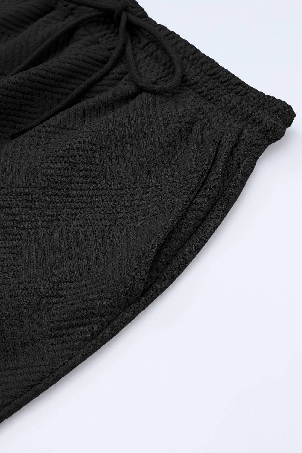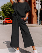 This playful lounge set in black features a boxy short sleeve top and wide-leg cropped pants with a comfy drawstring waist. Made from soft, geometric textured fabric, it’s perfect for relaxing at home or stepping out in style. Functional pockets add convenience, while the relaxed fit keeps you cozy and chic all day long.