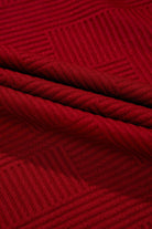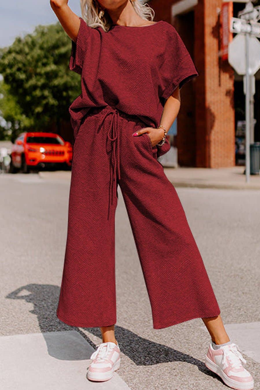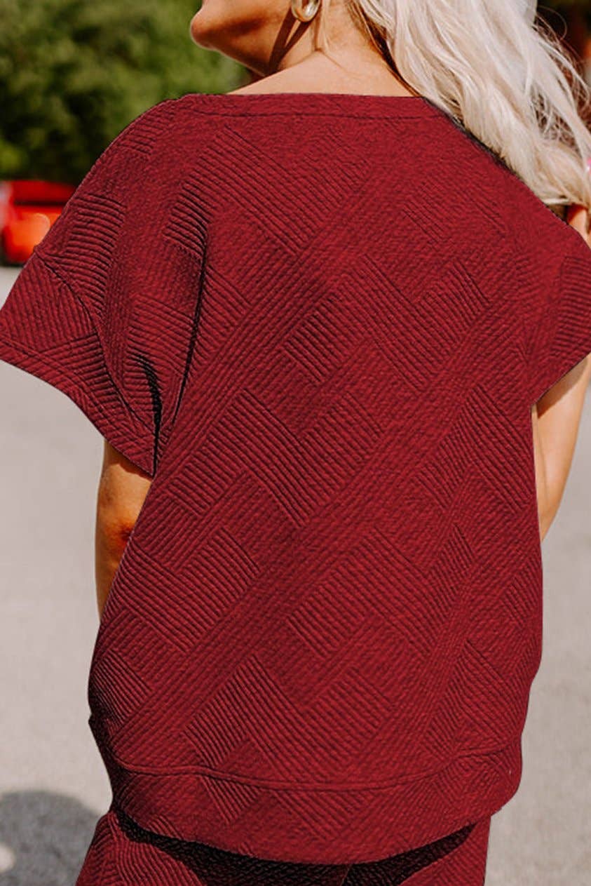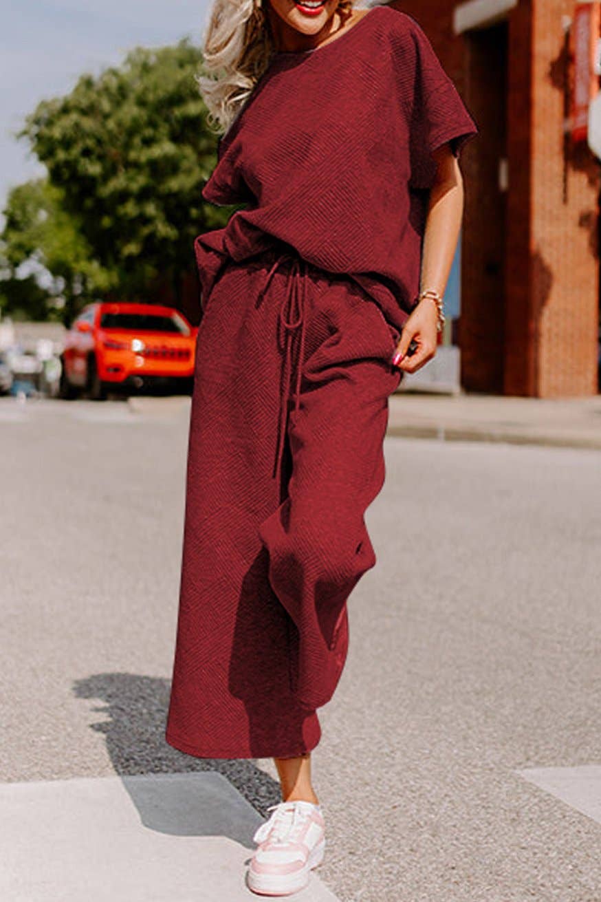 This playful lounge set in red wine features a boxy short sleeve top and wide-leg cropped pants with a comfy drawstring waist. Made from soft, geometric textured fabric, it’s perfect for relaxing at home or stepping out in style. Functional pockets add convenience, while the relaxed fit keeps you cozy and chic all day long.