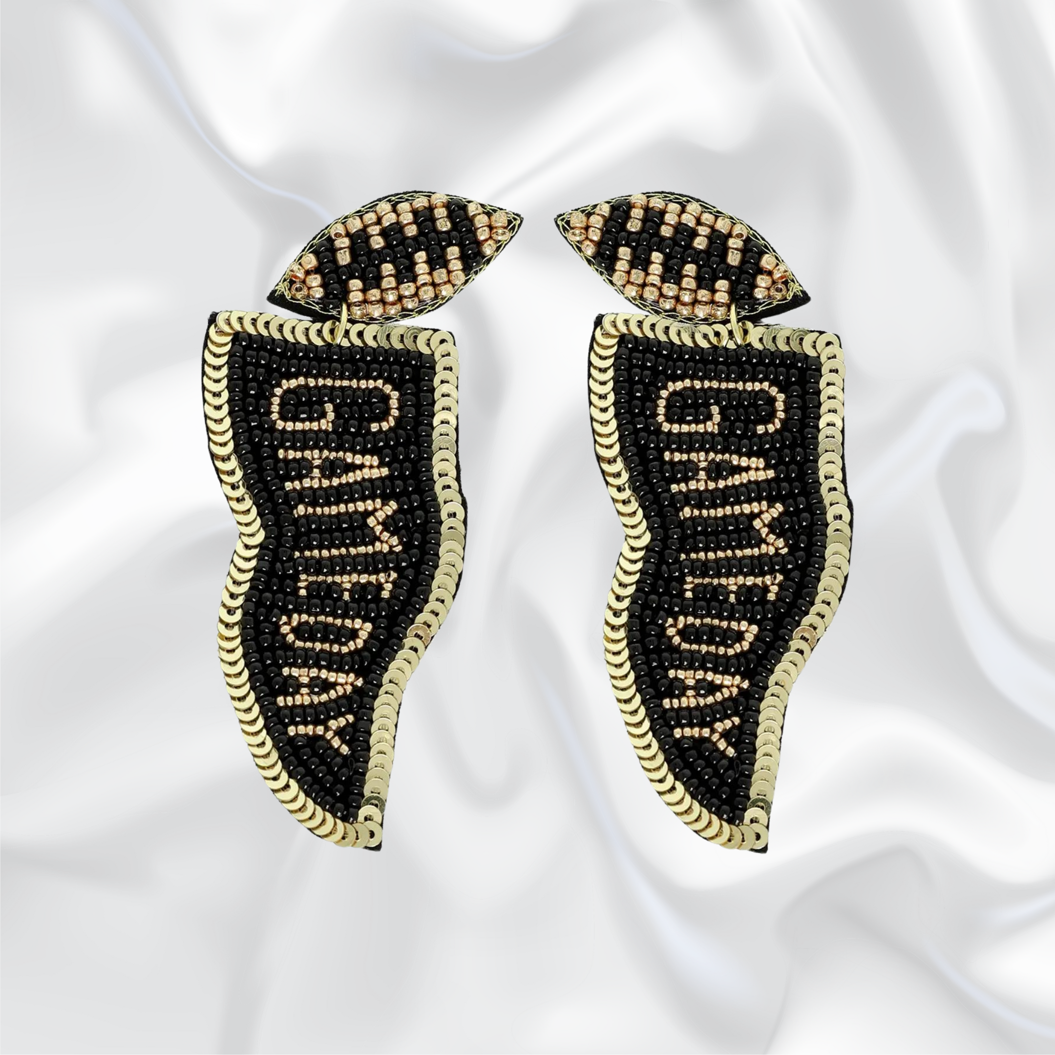 These Black & Gold Game Day Flag Beaded Earrings are a must-have for any sports fan! With a bold black base, dazzling gold trim, and eye-catching lettering, these lightweight beaded earrings are designed to stand out. Shaped like an iconic wavy flag with a football at the hook, they’re perfect for showing off your team spirit in style!